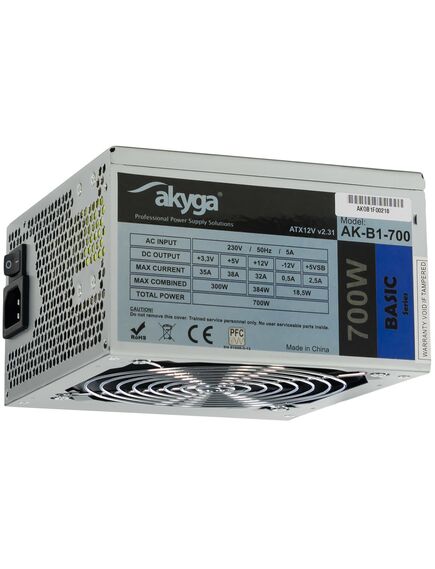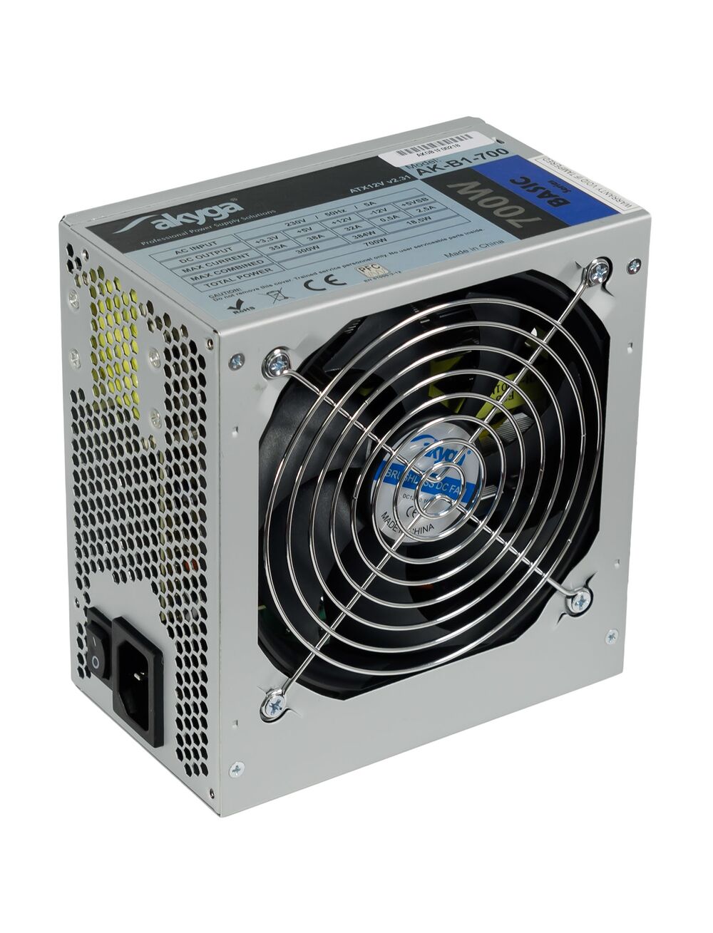 Akyga AK-B1-700. Συνολική ισχύς: 700 W, Τάση εισόδου AC: 220 - 230 V, Συχνότητα εισόδου AC: 50 Hz. Υποδοχή τροφοδοσίας μητρικής πλακέτας: 20+4 pin ATX, Μήκος καλωδίου τροφοδοσίας μητρικής πλακέτας: 45 cm, Μήκος καλωδίου τροφοδοσίας SATA: 150,300 mm. σκοπός: PC, Συντελεστής μορφής μονάδας τροφοδοτικού (PSU): ATX, Ποσοστό MTBF: 100000 h. Χρώμα προϊόντος: Γκρι, Τύπος ψύξης: Ενεργός, Διάμετρος ανεμιστήρα: 12 cm. Πλάτος: 150 mm, Βάθος: 160 mm, Ύψος: 85 mm