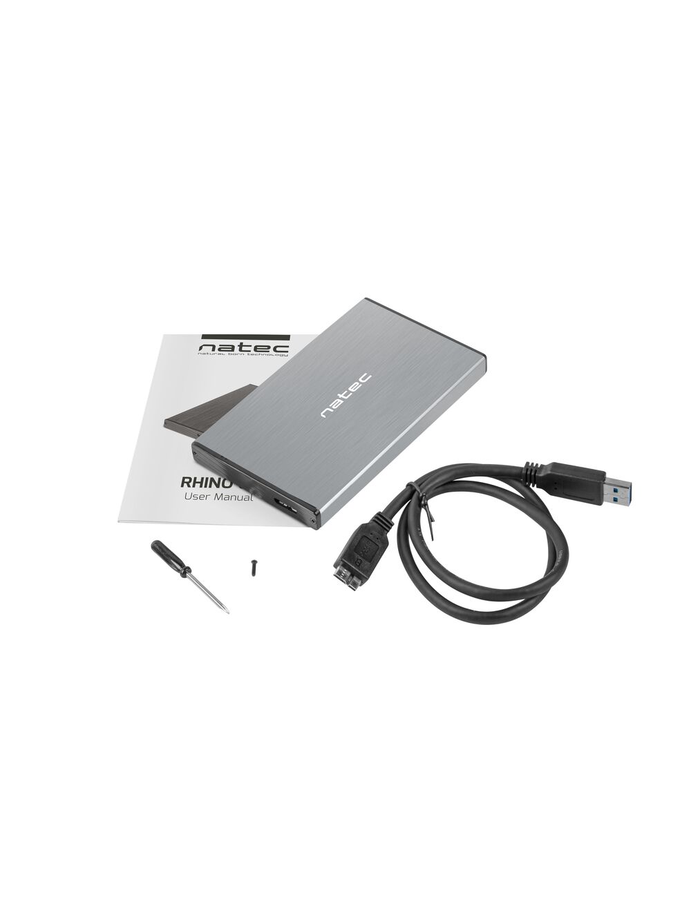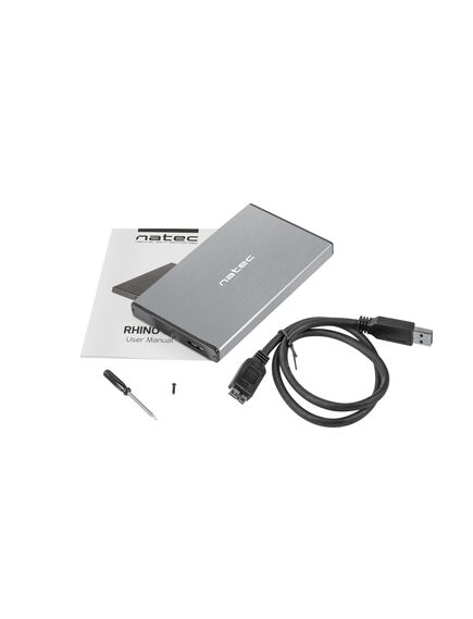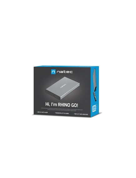 NATEC Rhino GO. Τύπος προϊόντος: Πλαίσιο HDD/SSD. Αριθμός υποστηριζόμενων οδηγών αποθήκευσης: 1, Μέγεθος μονάδας αποθήκευσης: 2.5", Υποστηριζόμενες διεπαφές συσκευών αποθήκευσης: Serial ATA III, Μέγιστη χωρητικότητα αποθήκευσης: 2 TB. Ρυθμός μεταφοράς δεδομένων: 6 Gbit/s. Χρώμα προϊόντος: Γκρι. Σύνδεσμος USB: Micro-USB