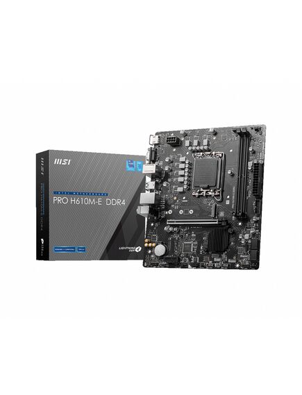 MSI PRO H610M-E DDR4. Κατασκευαστής επεξεργαστή: Intel, Υποδοχή επεξεργαστή: LGA 1700, Επεξεργαστής: Intel® Core™ i9. Υποστηριζόμενοι τύποι μνήμης: DDR4-SDRAM, Μέγιστη εσωτερική μνήμη: 64 GB, Τύποι υποδοχών μνήμης: DIMM. Υποστηριζόμενες διεπαφές συσκευών αποθήκευσης: M.2, SATA III, Υποστηριζόμενοι τύποι μονάδας αποθήκευσης: HDD & SSD. Τύπος διασύνδεσης δικτύου Ethernet: Gigabit Ethernet. Εξάρτημα για: PC, Form factor μητρικής πλακέτας (motherboard): micro ATX, Οικογένεια chipset μητρικής κάρτας: Intel